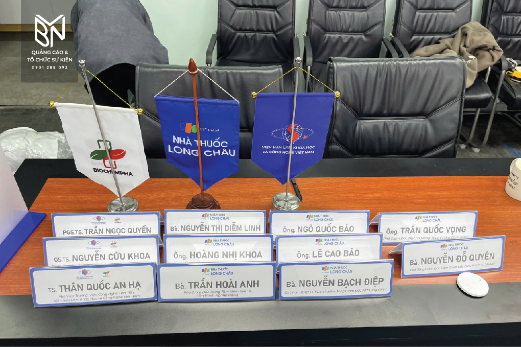 - Bảng tên, Standee: Chúng tôi thiết kế và thi công bảng tên đại biểu, standee giới thiệu chương trình, đối tác và các sản phẩm liên quan. Các bảng tên và standee được đặt tại các vị trí chiến lược để dễ dàng tiếp cận thông tin và hướng dẫn khách mời.