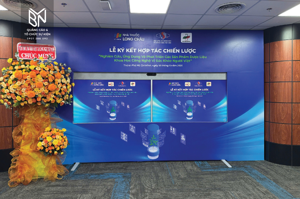 Backdrop bắt mắt: Sử dụng logo, slogan của cả hai bên một cách hài hòa, kết hợp với thiết kế đơn giản nhưng tinh tế để tăng tính nhận diện thương hiệu và truyền tải thông điệp chính của sự kiện. BVN sáng tạo những thiết kế backdrop độc quyền, không trùng lặp.