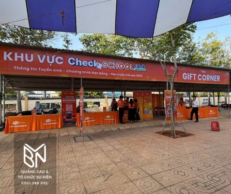 Tạo Ấn Tượng Ban Đầu: Ngay từ cái nhìn đầu tiên, các bạn học sinh và khách mời đã bị thu hút bởi không gian đón tiếp được BVN dàn dựng công phu. Đội ngũ của BVN đã tỉ mỉ sản xuất và thi công cổng chào, backdrop, banner với thiết kế hiện đại, nổi bật, vừa truyền tải thông điệp chính của sự kiện, vừa tạo nên một không gian check-in ấn tượng.