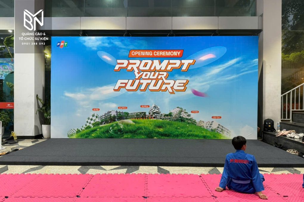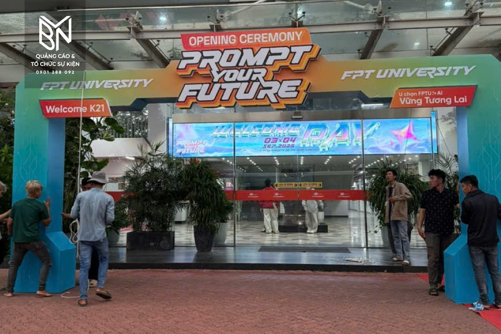 - Cổng chào sự kiện được thiết kế theo chủ đề “Prompt Your Future,” sử dụng các họa tiết đồ họa và đèn LED hiện đại, tạo cảm giác như một cổng thông tin bước vào thế giới số. Đây không chỉ là một lối vào mà còn là một điểm check-in “sống ảo” cực kỳ ấn tượng, thu hút đông đảo sinh viên và phụ huynh.