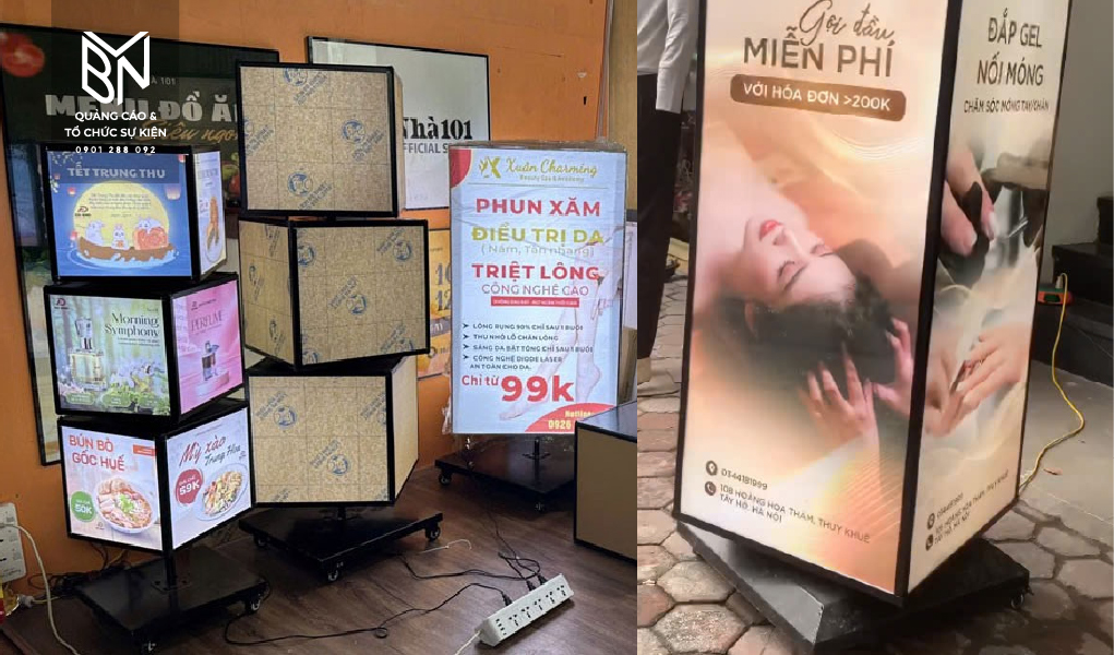 - Điểm nhấn: Hộp đèn có chân đứng vững chắc và tích hợp bánh xe, giúp dễ dàng di chuyển và thay đổi vị trí quảng cáo linh hoạt. Thường là loại 2 mặt sáng.