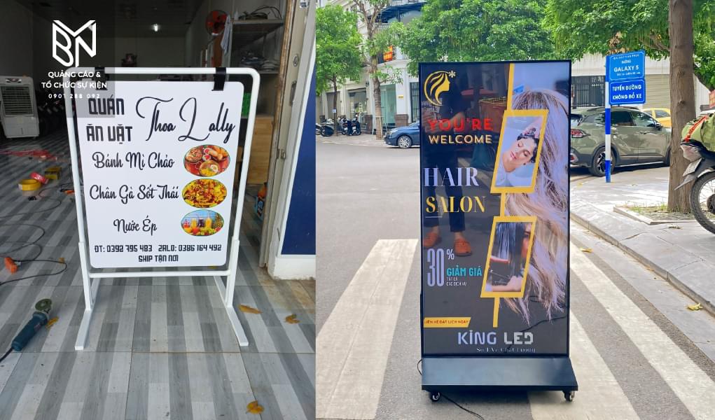 - Hộp Đèn Siêu Mỏng Chân Chữ A/Chữ T: Dễ dàng di chuyển, lý tưởng cho việc đặt ở sảnh, cửa ra vào, triển lãm, sự kiện.