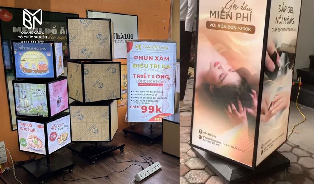 - Điểm nhấn: Hộp đèn có khả năng xoay tròn 360 độ quanh trục, với nhiều mặt quảng cáo (thường là 4-5 mặt), thu hút sự chú ý từ mọi góc nhìn, tạo hiệu ứng thị giác động.