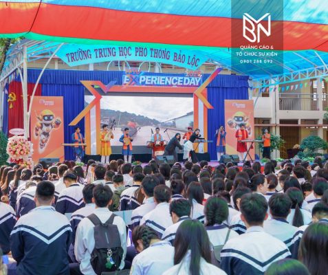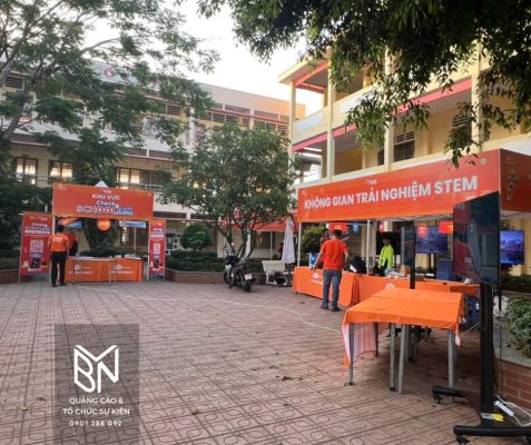 Trang Bị Hiện Đại Hỗ Trợ Trải Nghiệm: Chúng tôi cũng đã cho thuê các thiết bị sự kiện đa dạng như Standee cuốn nhôm 0.8m x 1.8m để hiển thị thông tin chi tiết các ngành học, và Tivi 55 inch tại các khu vực trải nghiệm chuyên biệt, giúp học sinh dễ dàng tiếp cận và tương tác với nội dung.