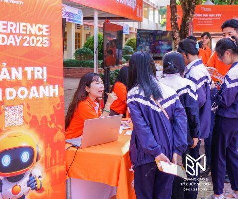 Thiết kế và Dựng Không Gian Ấn Tượng: BVN chịu trách nhiệm thi công backdrop, banner và toàn bộ không gian trang trí sự kiện. Chúng tôi đã tạo ra một tổng thể hài hòa, chuyên nghiệp, phản ánh đúng tinh thần trẻ trung, sáng tạo của FPT University, đồng thời đảm bảo mọi khu vực đều tối ưu cho việc trưng bày và tương tác.