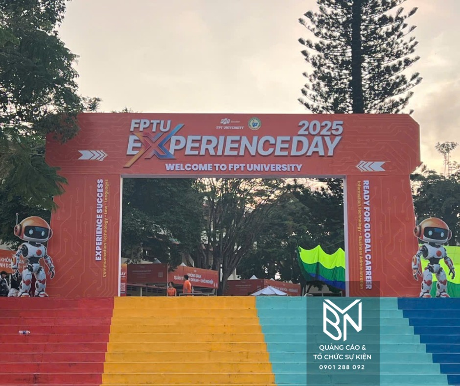 Thiết kế và Dựng Không Gian Ấn Tượng: BVN chịu trách nhiệm thi công backdrop, banner và toàn bộ không gian trang trí sự kiện. Chúng tôi đã tạo ra một tổng thể hài hòa, chuyên nghiệp, phản ánh đúng tinh thần trẻ trung, sáng tạo của FPT University, đồng thời đảm bảo mọi khu vực đều tối ưu cho việc trưng bày và tương tác.