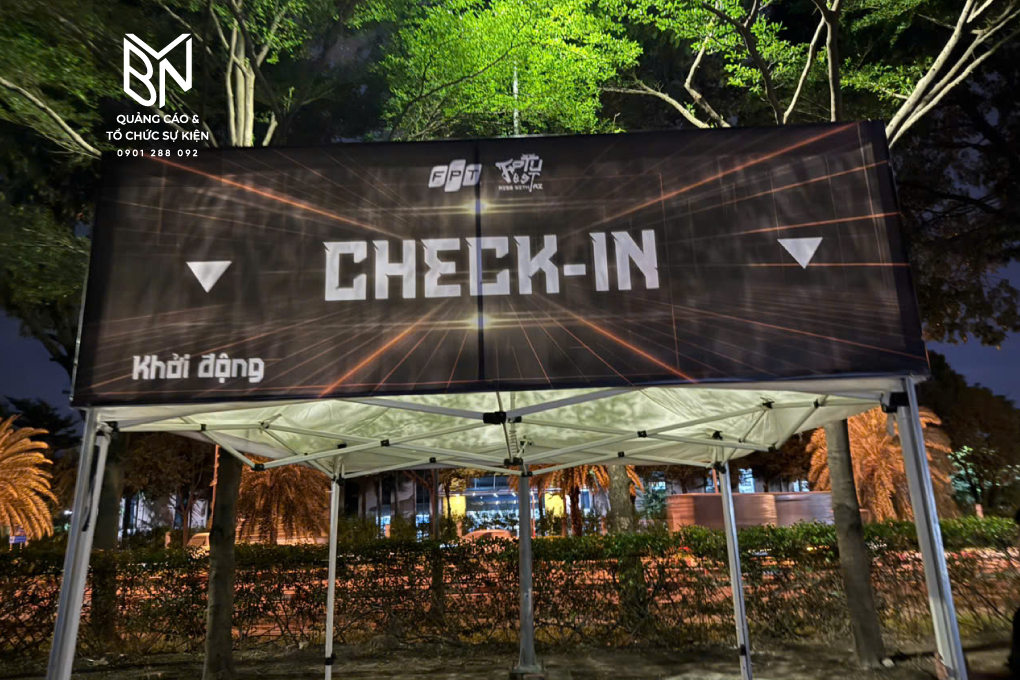 - Hệ thống nhận diện và trang trí: Sự kiện được tô điểm bởi các hạng mục trang trí đa dạng như bandroll dài thả trước cửa trống đồng, phướn vải, cờ dây đủ màu sắc, standee sự kiện, và bandroll dọc treo cây khu checkin. Mỗi hạng mục đều được in ấn và lắp đặt tỉ mỉ, tạo nên một tổng thể hài hòa, rực rỡ và tràn đầy không khí lễ hội. BVN cũng cung cấp nhà lều, thảm và bảng hướng dẫn gửi xe để đảm bảo sự kiện diễn ra thuận lợi, an toàn và chuyên nghiệp.