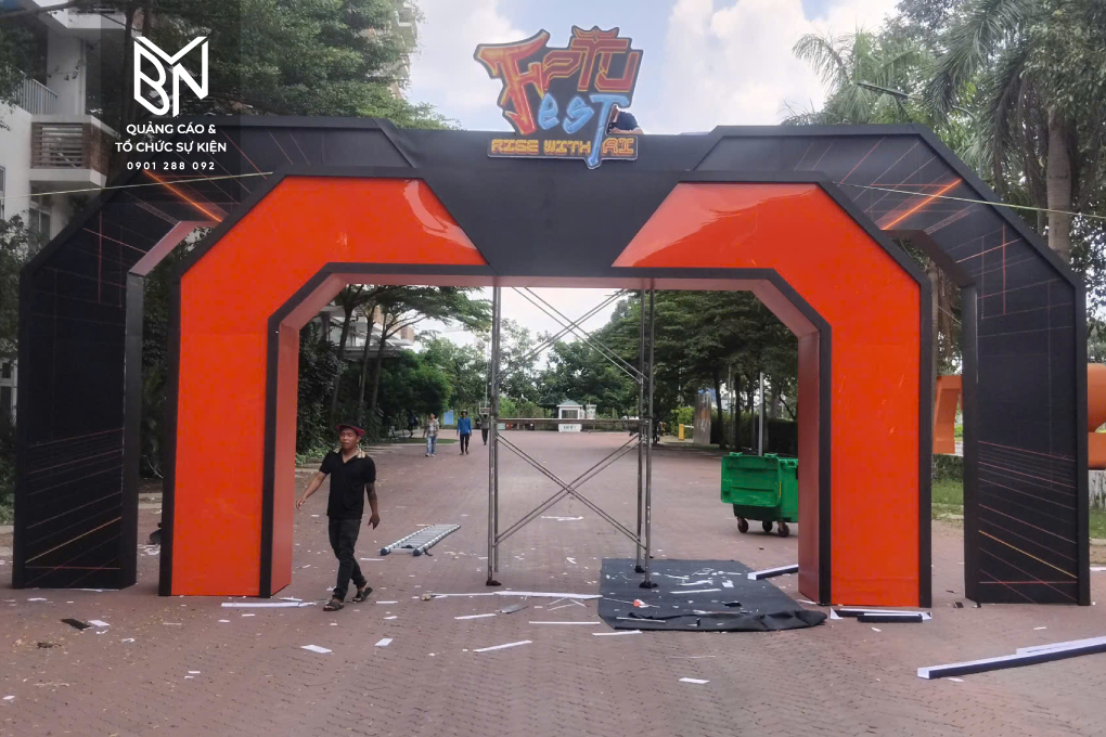- Cổng chính và Backdrop Cổng chính: Đây là điểm nhấn đầu tiên, nơi chào đón hàng chục nghìn người tham dự. Thiết kế cổng chính được lấy cảm hứng từ tinh thần trẻ trung, năng động của Gen Z, sử dụng các hình ảnh, màu sắc rực rỡ và khẩu hiệu ấn tượng. Backdrop cổng chính được in ấn với công nghệ cao, đảm bảo màu sắc sống động và sắc nét, tạo ấn tượng mạnh mẽ ngay từ cái nhìn đầu tiên.